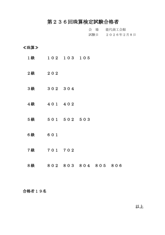 2月8日(日)実施しました、第236回珠算検定・第146回段位認定試験の結果です。